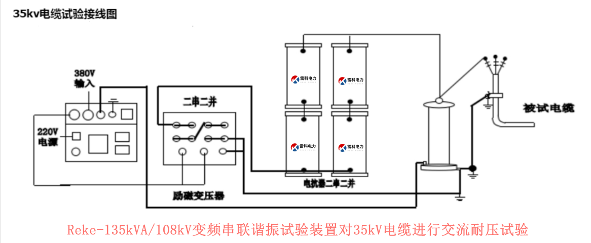 答:GB50150-2006《電氣裝置安裝工程電氣設備交接試驗標準》中18.0.5條表18.0.5規定10kv電纜試驗電壓為(2.5U0),試驗時間為5min(2.5U0時)。10KV電纜是一般有6/10KV和8.7/10KV兩種,這兩種電纜的U0是不相同的。根據試驗標準6/10KV是施加15KV(6x2.5=15)交流電5分鐘,電纜不擊穿;而8.7/10KV則是施加21.75KV(8.7x2.5=21.75)交流電5分鐘,電纜不擊穿。推薦使用Reke-135kVA/108kV變頻串聯諧振試驗裝置對35kV電纜進行交流耐壓試驗,根據不同橫截面積的電纜選擇串聯高壓電抗器還是并聯高壓試驗電抗器。采用兩節高壓電抗器串聯和并聯的方式進行耐壓試驗。