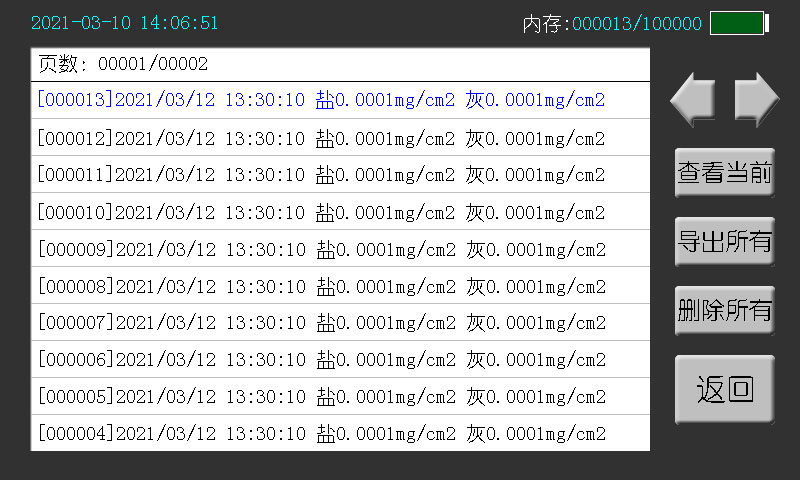 鹽密基準值:在測量頁點“校準”按鈕后會自動保存溶液的初始鹽密值作為“鹽密基準值”,也可以用戶自定義。